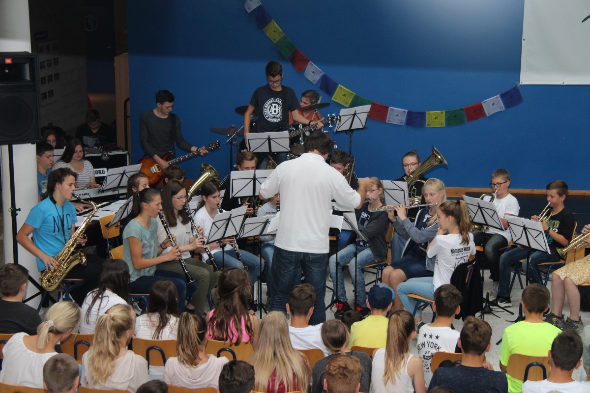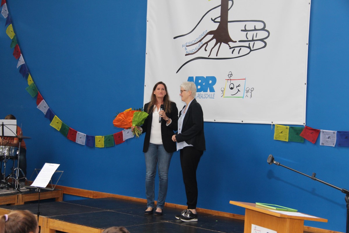 Nach einer kurzen Vorführung eines während der Projektwoche erarbeiteten Tanzes, überreichte Monika Schwarz der Sekretärin Katja Scheffel als Dank für ihre ständige Arbeit einen Blumenstrauß. Ein herzliches Dankeschön ging auch an die Band unter der Leitung von Christoph Blaumeiser und die Chöre schwungvoll dirigiert von Jessica Egger und Lisa Waltenberger. Anschließend gab es für alle Schülerinnen und Schüler die Zeugnisse, welche die Klassenlehrer in den Klassenzimmern überreichten. Danach begannen wirklich die Sommerferien.