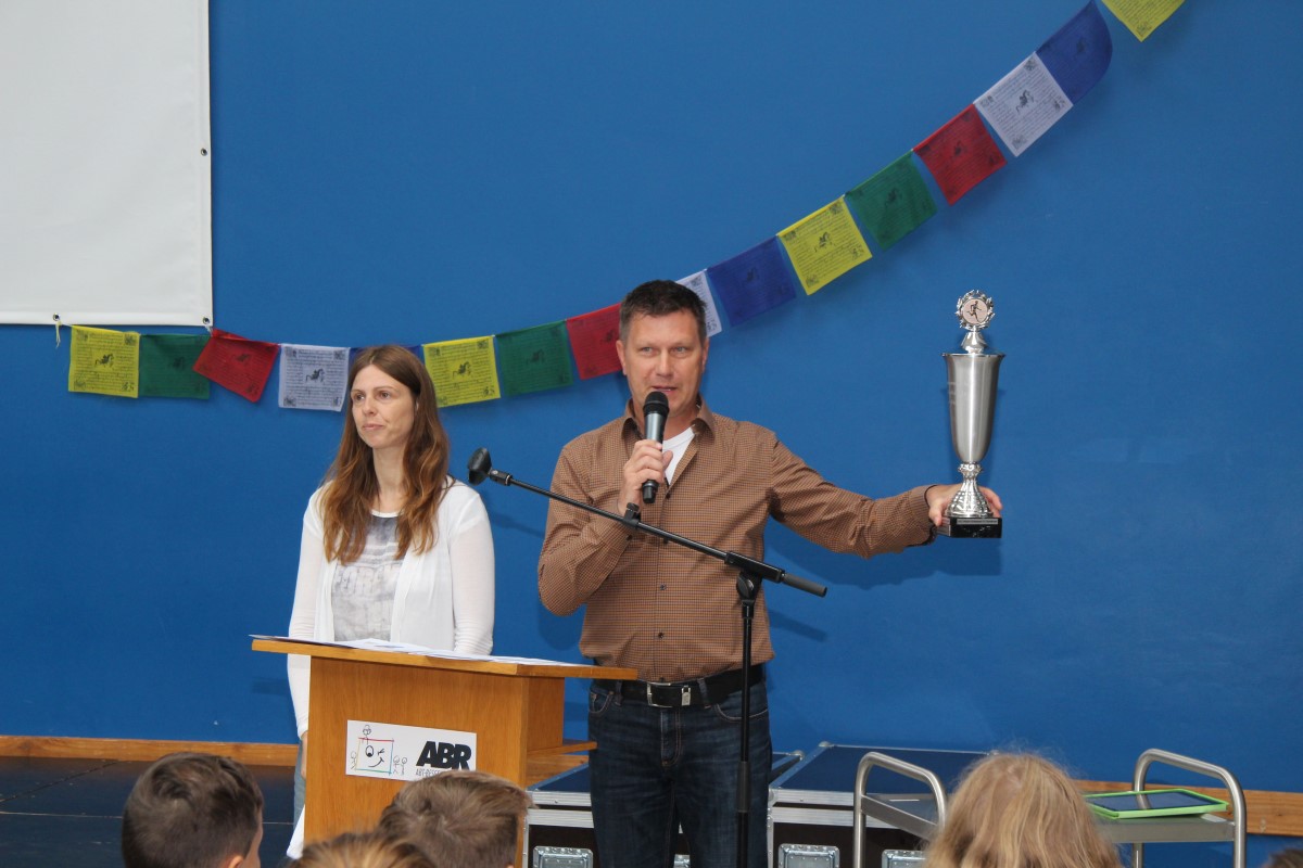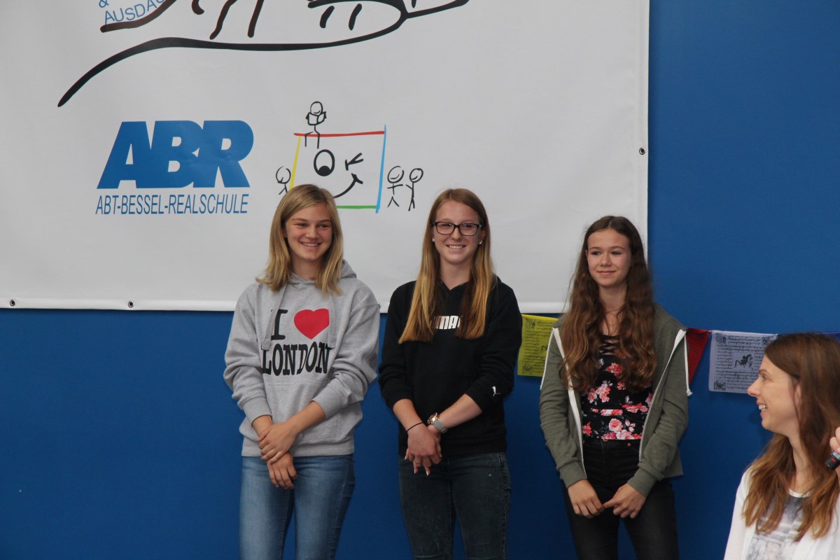 Frau Felleisen und Herr Weißschädel ehrten die Sieger der Leichtathletikendkämpfe. Das Team der Mädchen errang den ersten Platz der 15 Mannschaften. Die Jungenmannschafften verpassten mit dem 4. Platz knapp das Treppchen. Die ersten drei Plätze bei der Einzelbewertung der Mädchen gingen alle an die Abt-Bessel-Realschule: Curly-Ann Fischer (1. Platz), Marielle Cinque (2. Platz), Karin Sans (3. Platz).