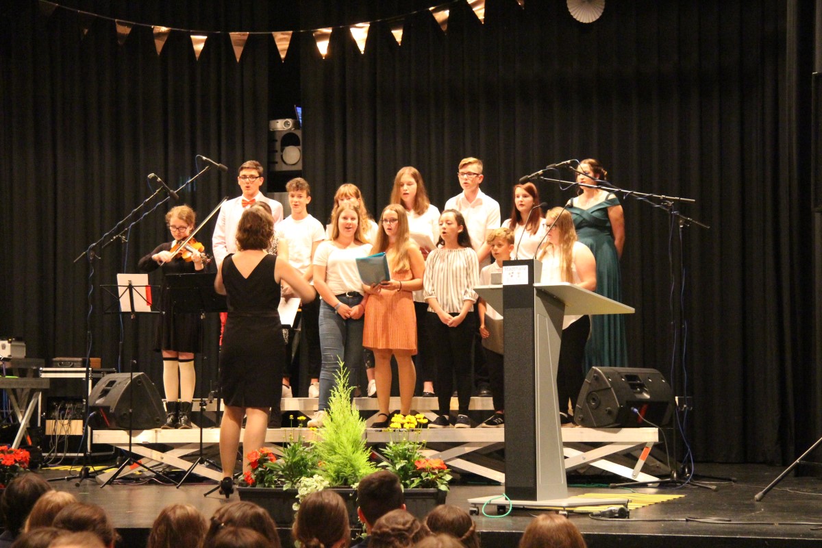 Für musikalische Höhepunkte sorgten neben der Bigband, die mit „Skyfall“ und „Rolling in the deep“ weiter zu begeistern wusste, der Chor der Abt-Bessel-Realschule. Unter der Leitung von Jessica Egger stellten sie mit dem schottischen Klassiker „Loch Lomond“ und „Every breath you take“ ihre gesanglichen Qualitäten unter Beweis und ernteten tosenden Applaus. Den musikalischen Abschluss bildete schließlich noch einmal die Bigband, die mit „It don’t mean a thing“ das offizielle Programm einer rundum gelungenen Entlassfeier abrundeten und sogar mit stehenden Ovationen belohnt wurden.