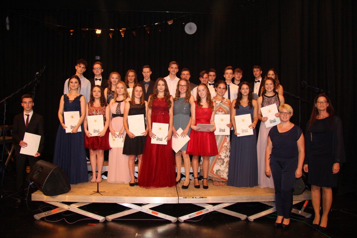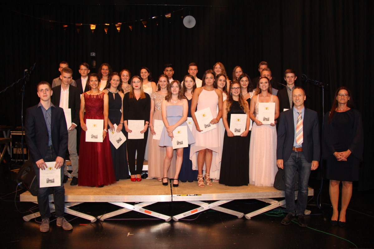 Zur Preisverleihung wurden schließlich alle vier Klassen nacheinander auf die Bühne gebeten. Feierlich überreichten Monika Schwarz und Magnus Brünner die Zeugnisse und die Schulleitung gratulierte gemeinsam mit den jeweiligen Klassenlehrern Ilka Brand (10a), Gunther Erg (10b), Regina Gedemer (10c) und Andrea Henrich (10d) zur bestandenen Prüfung.