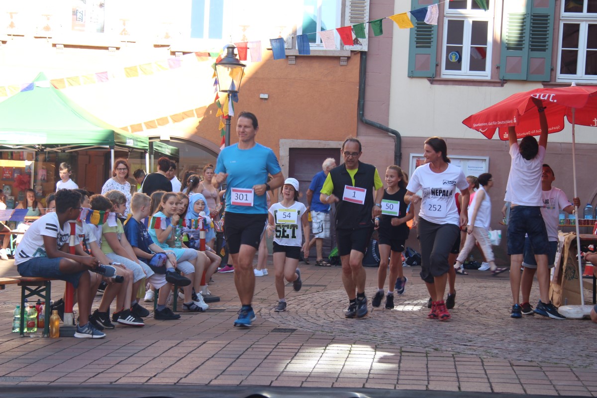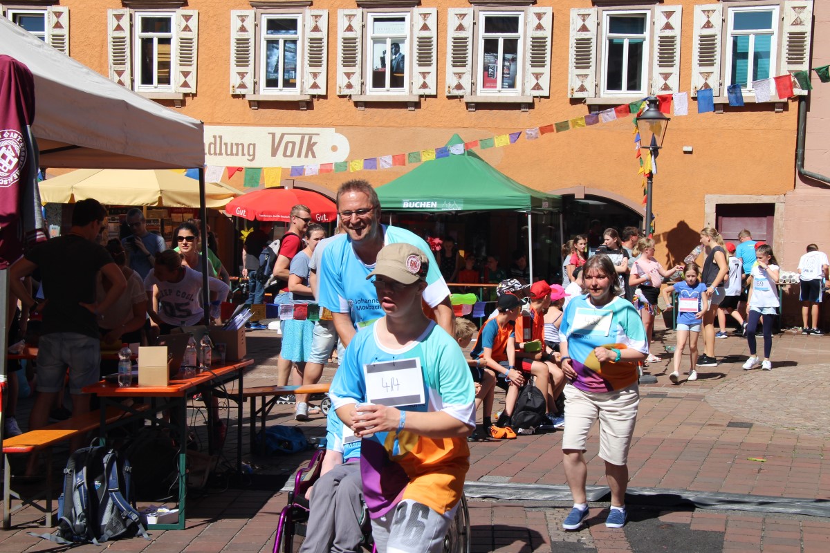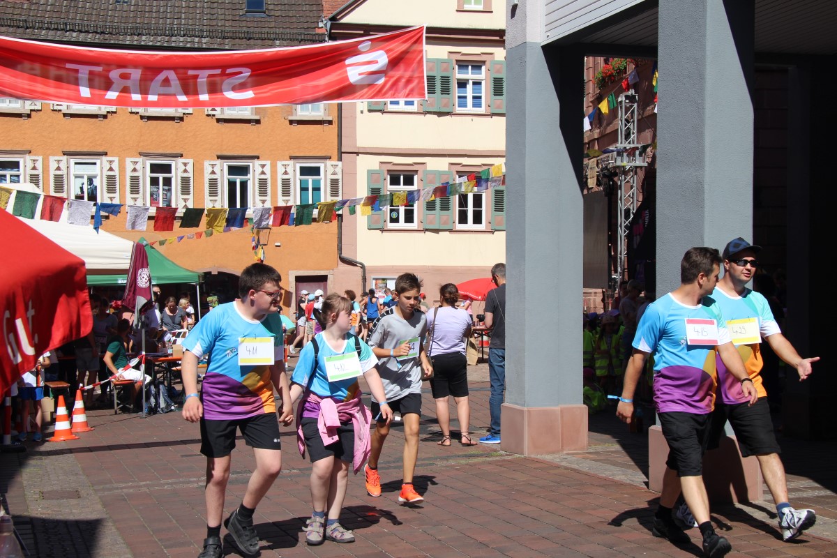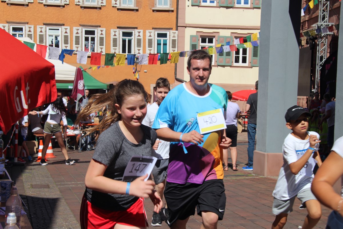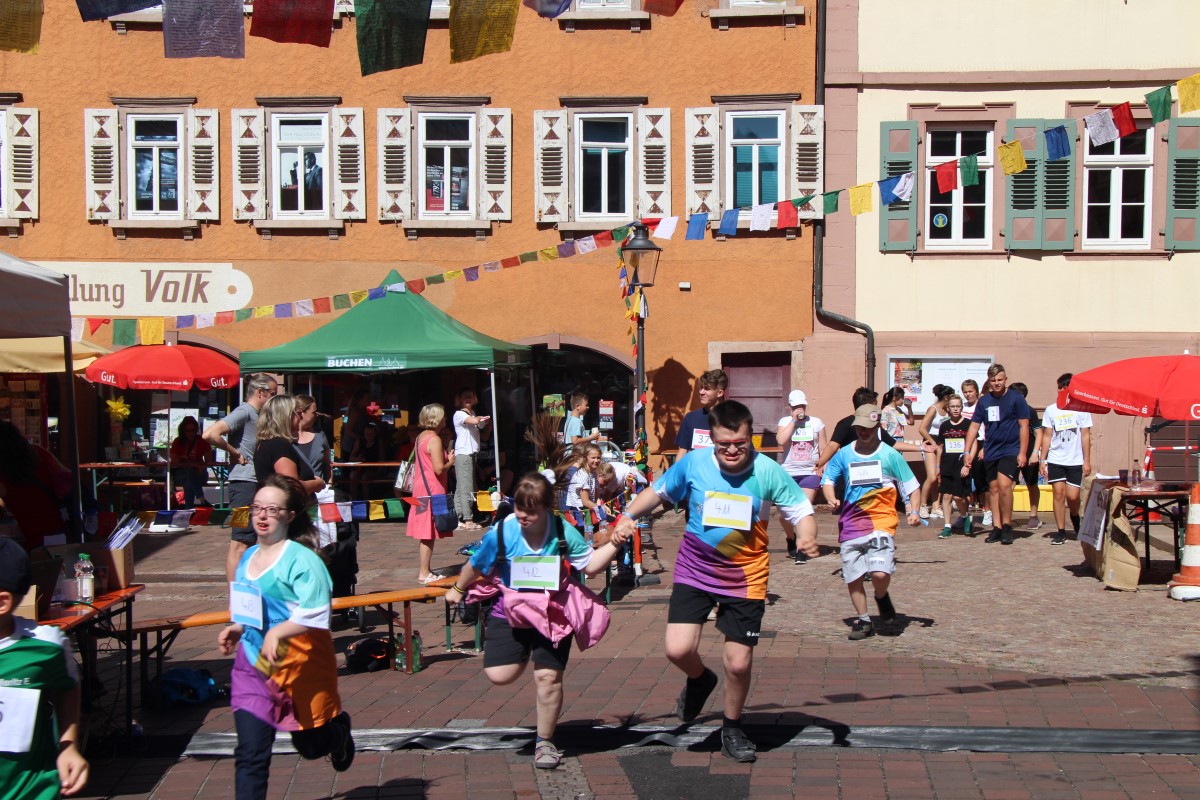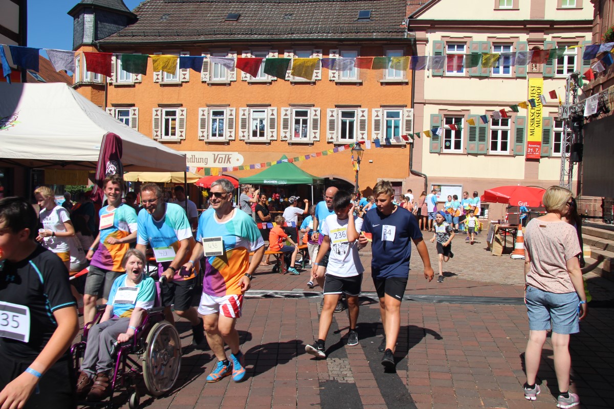 Lehrer Daniel Schäfer erklärte, dass sie natürlich jeden Euro gut gebrauchen können, die eigentliche Sensation sei jedoch, zu sehen, wie sich an diesem Tag vier Generationen gemeinsam für andere Menschen in einem der ärmsten Länder der Welt engagieren. So waren aus einer Familie die Enkel mit ihrem Kindergarten und ihrer Schule, die Mütter mit Kinderwagen und der Großvater mit Rollator mit seiner Tagespflegegruppe gelaufen. Das waren Bilder, die unter die Haut gingen. Das gemeinsame Laufen, egal wie jung oder alt, egal ob fit oder nicht und das Gefühl in einer kleinen Gruppe, die Welt ein Stückchen besser zu machen, beflügelten an diesem Tage viele. So liefen am Vormittag Schüler der ABR, der Hettinger Grundschule und der Wimpina-Grundschule und mischten sich auf der Strecke unter 51 Kinder des Kindergartens "Regenbogen" und die Läufer der Diakonie Buchen und Wertheim, die mit Rollstuhl und sich an den Händen haltend unermüdlich Runden drehten. Später liefen noch Kinder des Kindergartens St. Rochus, Schüler der Zentralgewerbeschule und der Helene-Weber-Schule, die Initiative "Herz statt Hetze", sowie Gruppen von verschiedenen Unternehmen, Vereinen und auch Zuschauer, die sich spontan mitreißen liesen und sich noch schnell gegenseitig sponsorten.