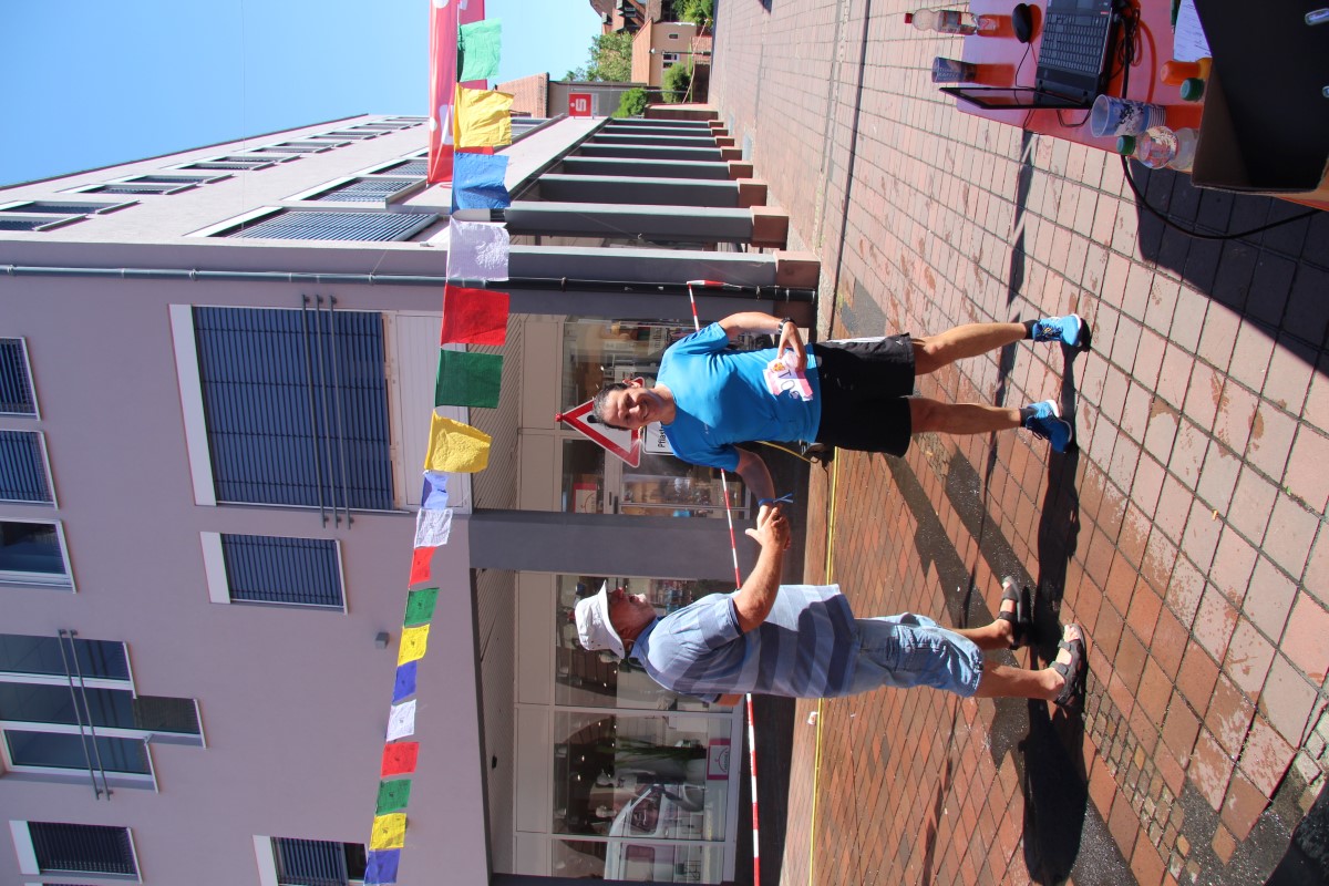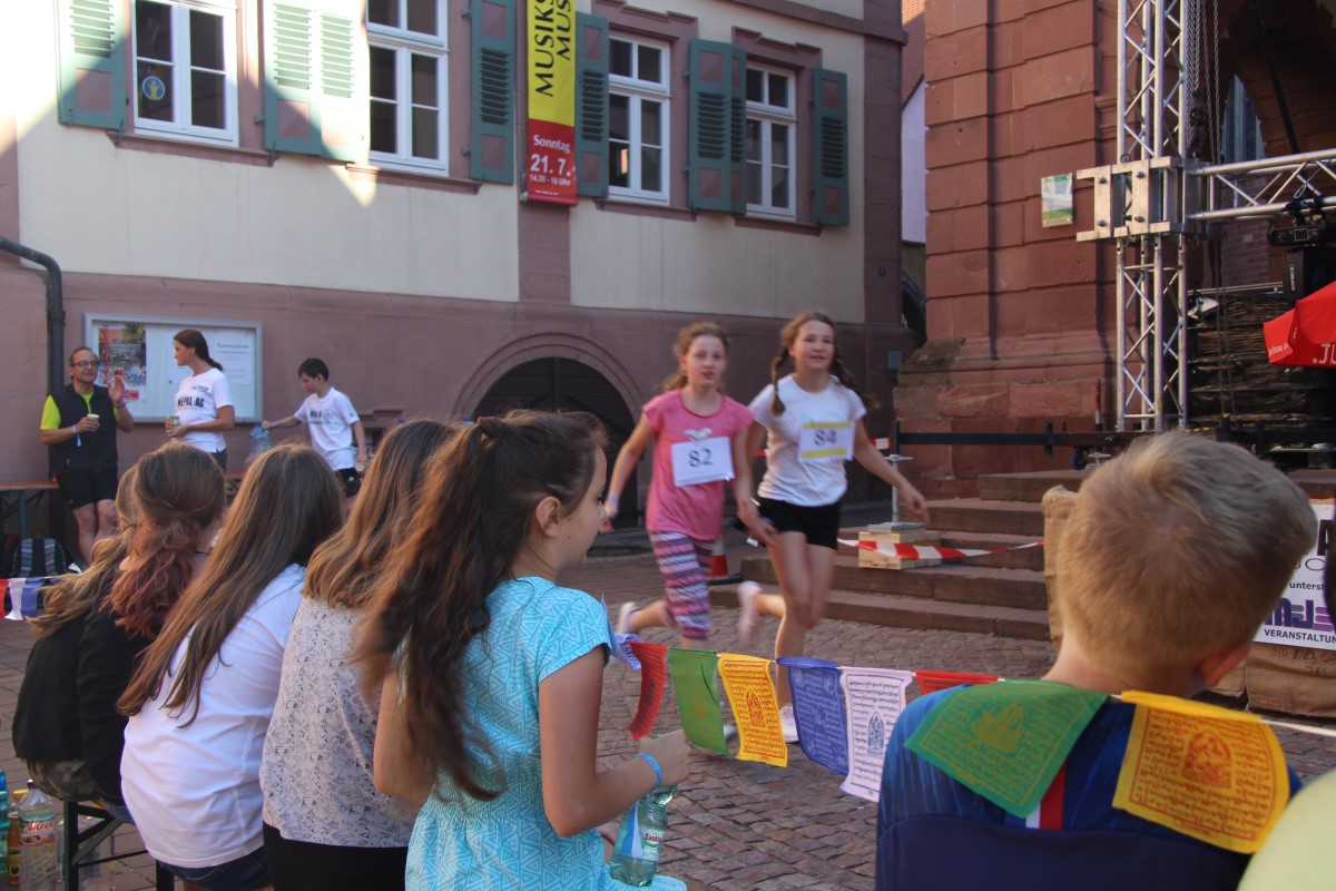 Ein buntes Meer aus Gebetsfahnen schmückte am Freitag, 28.06.209, die Buchener Altstadt. Die Namaste Nepal sAG, Schülerfirma der Abt-Bessel Realschule veranstaltete zum zweiten Mal den Buchener Nepallauf. Nach einem alten nepalesischen Glauben sollen die Wünsche und Gebete, die auf die bunten Fahnen geschrieben sind vom Wind in die Welt getragen werden. Dies zeigte offensichtlich Wirkung, denn bei stahlend blauem Himmel und sommerlichen Temperaturen kamen 530 Läufer, die gemeinsam die stolze Spendensumme von 20.001,80 Euro erreichten. Von 08 Uhr bis 20 Uhr konnten Läufer auf der 425m langen Strecke Runden für den guten Zweck drehen und so ihre Sponsoren zur Kasse bitten. Sponsor konnter jeder sein und so wurden sie unterstützt von Firmen, Eltern, Nachbarn oder ganz spontan von Zuschauern.
