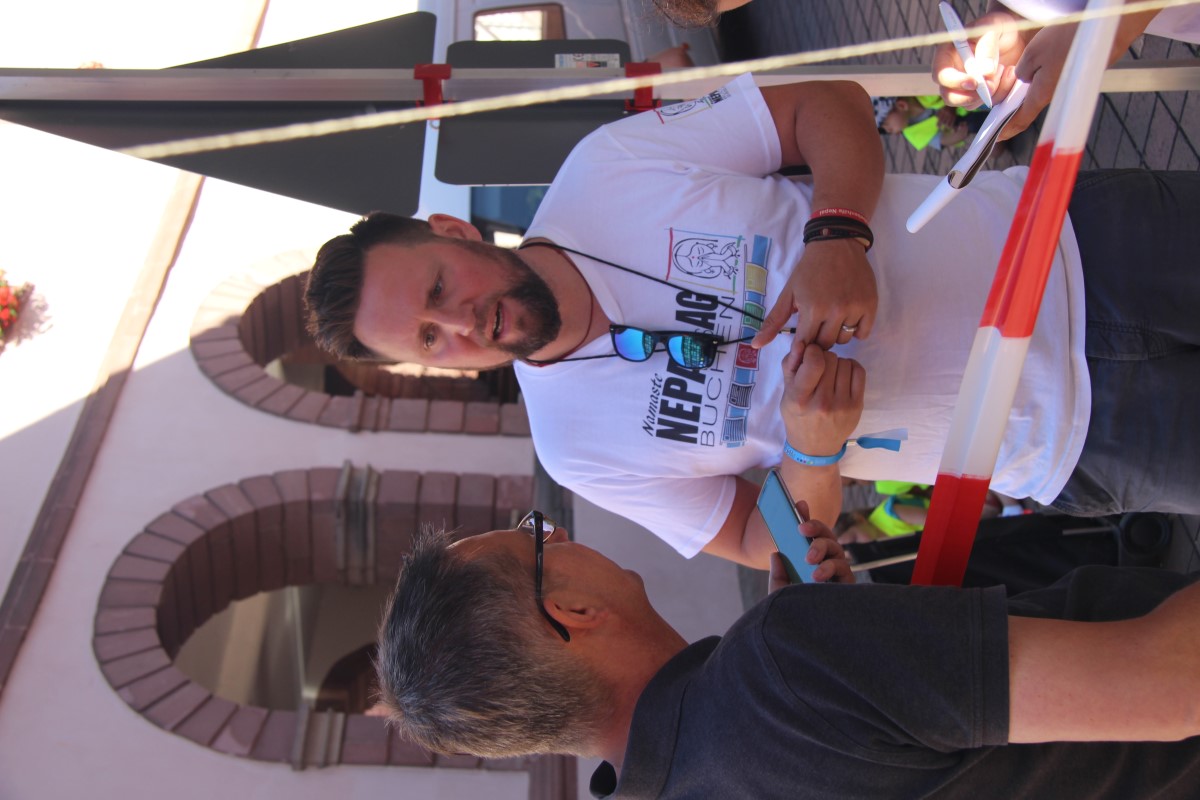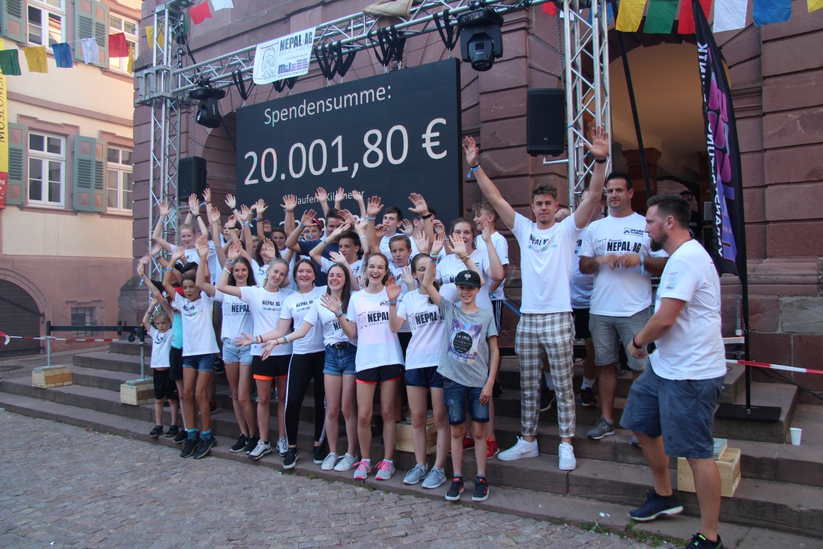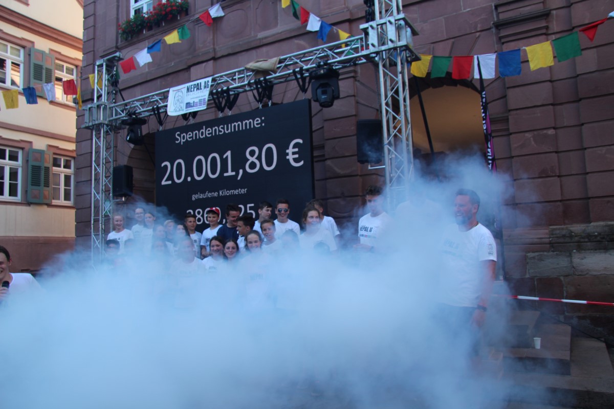 Um 20 Uhr liefen die Schüler der Namaste Nepal SAG die letzte Runde des Tages mit weiteren Läufern und beendeten den Tag mit einem spektakulären Finale gemeinsam mit den über hundert Zuschauern. Die Anstrengungen des Tages und die Emotionen waren allen anzusehen und gingen in lauten Jubel über, als die LED Leinwand das Endergebnis von 20.001,80 EUR anzeigte. Die große Leistung der 532 Läufer machen die Zahlen des Tages greifbarer, denn so wurden 91.000 Höhenmeter bewältigt, über zehn mal der Mount Everest bestiegen und 9105 Runden um die Buchener Stadtkirche gedreht, was 3869,6km, also ungefähr der halben Strecke von Buchen nach Nepal entspricht. Die fünftklässlerin Linda Flores lief 100 Runden, der 14-jährige Frederick Donath 145. Der 10 Jährige Nico Türschel hatte sich ebenfalls fest vorgenommen für die Kinder in Nepal alles zu geben und startete schon früh morgens gemeinsam mit seinem Vater Jürgen Türschel. Um 19.30 Uhr wurden die beiden unter tosendem Applaus und Moderator Kurt Bonaszewski, der begeistert durch den spannenden Tag führte, empfangen. Nico lief 150 Runden und sein Vater 200, was gemeinsam einer Strecke von unfassbaren 148km entspricht.