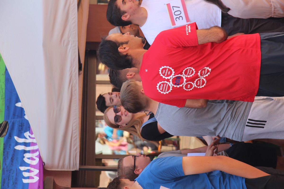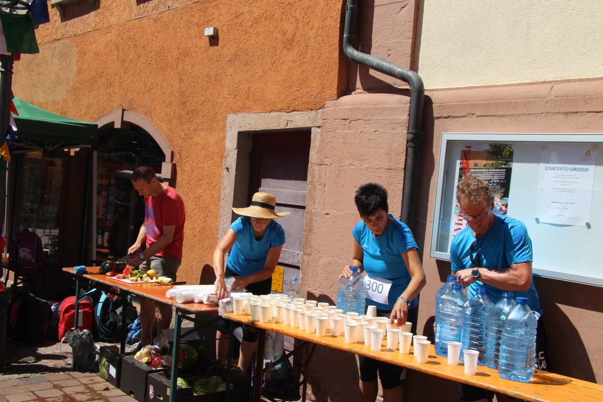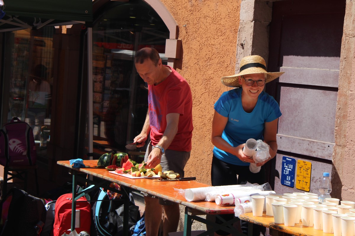 Die Eltern, freiwillige Helfer und die Schüler der Schülerfirma sorgten sich liebevoll um die Läufer und versorgten sie mit fast 40 Wassermelonen, Bananen, Äpfeln, gespendeten Müsliriegeln und viel Wasser. Mit kühlenden Schwämmen und einem Wassernebel zur Abkühlung wurde der Hitze getrotzt. Das Rote Kreuz sicherte die medizinische Versorgung und Jonas Link und sein Team kümmerten sich ehrenamtlich um die Technik. Zeitweise waren 25 Zähler notwendig, die hochkonzentriert jeden einzelne Runde der Läufer notierten.