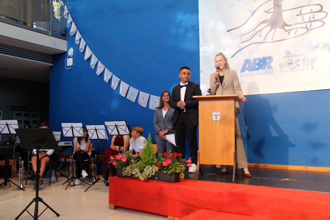 Die Schulsprecher Dean Mehl (10b) und Julia Kirschenlohr (10a) rundeten die Entlassfeier mit ihrer Rede ab. Sie betonten die gute Vorbereitung auf die Prüfungen seitens der Lehrkräfte und wünschten ihren Klassenkameraden eine vielversprechende Zukunft.