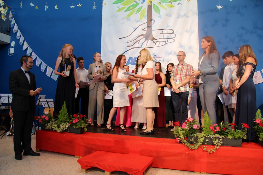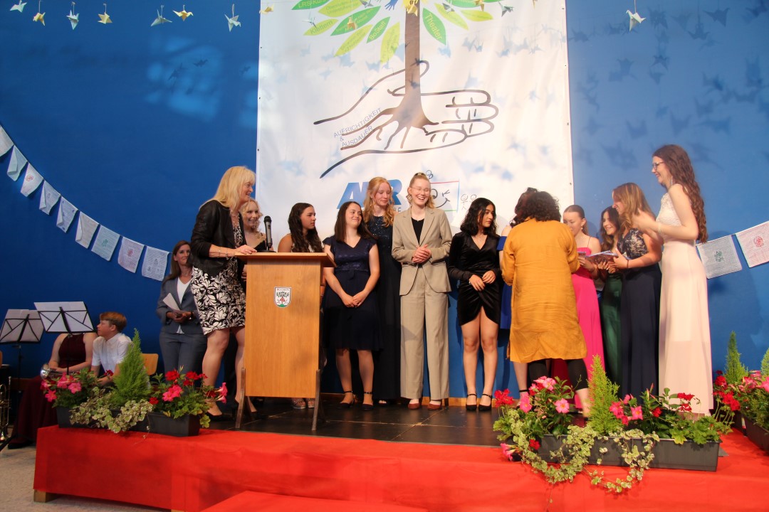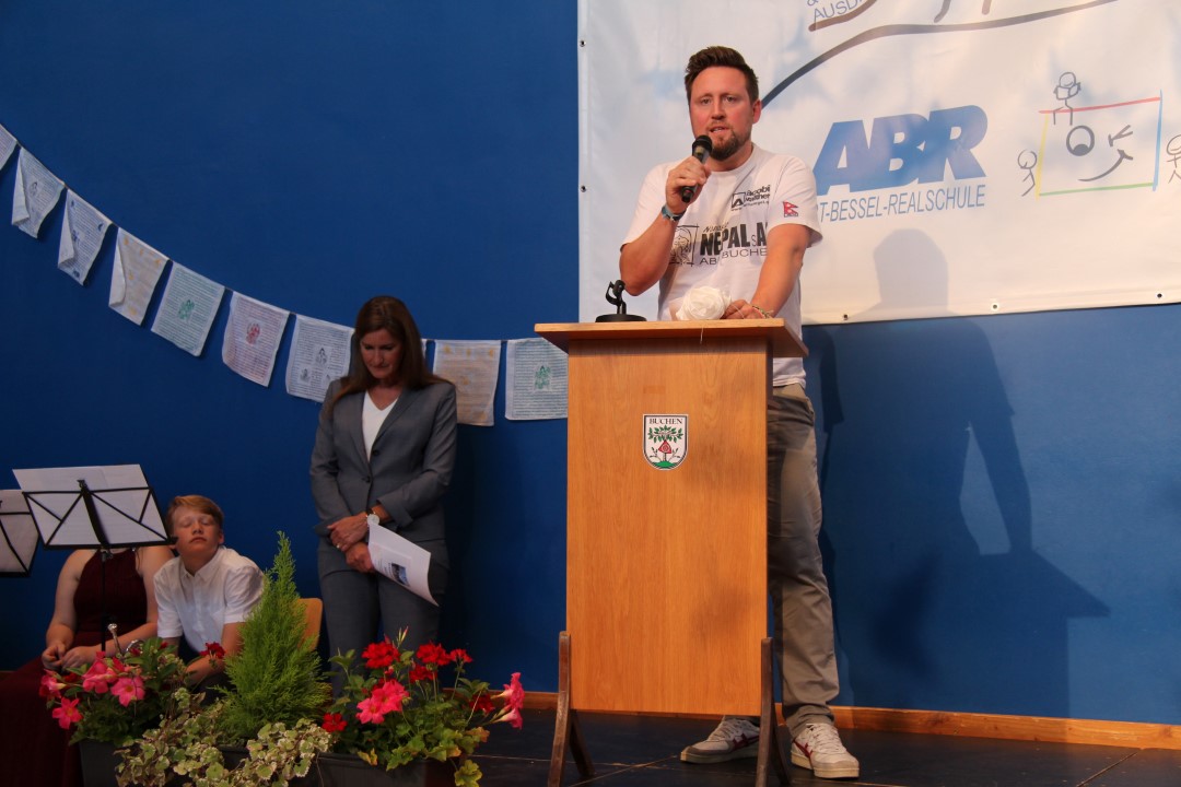 Anschließend erfolgte die Ehrung für außerordentliche Leistungen: Die Absolventinnen Dilay Cinar, Yagmur Cinar, Emme Hofmann, Julia Kirschenlohr, Nele Wilhelm (alle 10a), Jemima Haaß, Sarah Gramlich, Marie Hemberger (alle 10b), Emely Burgart und Vanesa Dikova (beide 10c) wurden für ihr Engagement als „Starkmacher-Schüler“ von Frau Mackert und Herrn Eger geehrt. Auch die Schülerinnen, die die Hausaufgabenbetreuung durchführten, erhielten eine Urkunde und großen Dank von Frau Geier und Frau Kieser. Darunter waren Tugce Pala, Julia Kirschenlohr, Yagmur Cinar, Emma Hofmann, Angelina Mitrovic, Ella Arnold, Leticia Kukshaus (alle 10a), Emma Münch und Sarah Gramlich (beide 10b). Danach wurden die „Nepalesen“ Sarah Gramlich, David Wiese, Dean Mehl, Marie Hemberger (alle 10b) und Nico Jaufmann (10a) von Herrn Schäfer und Frau Friedel verabschiedet.