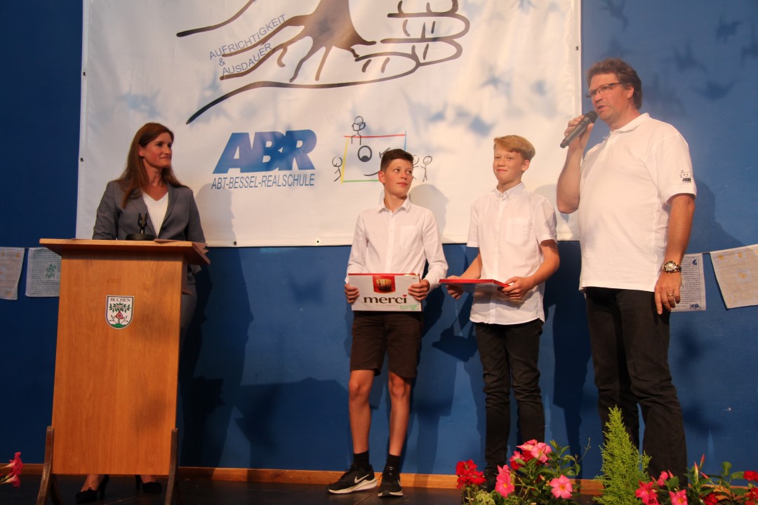 Anschließend spielte die Schulband das Stück „Havana“, bevor Frau Schwarz und Herr Brünner die Urkunden für Preise und Lobe an die Abschlussschüler überreichten. Danach folgten die Preise der Wahlpflichtfächer, welche allesamt von Ehemaligen der Abt-Bessel-Realschule gestellt wurden. Hier erhielt den Preis für herausragende Leistungen im Fach Technik Pascal Keller (10a), gestiftet von Marco Dosch aus Buchen. Der AES-Preis, gestiftet von Susanne Gehrig-Wünst aus Buchen, ging an Julia Kirschenlohr (10a) und Sarah Gramlich (10b) und der Französisch-Preis, gestiftet von Dr. Kurt Häfner aus Buchen, ging an Emma Münch (10b) und Evelina Retcher (10c).