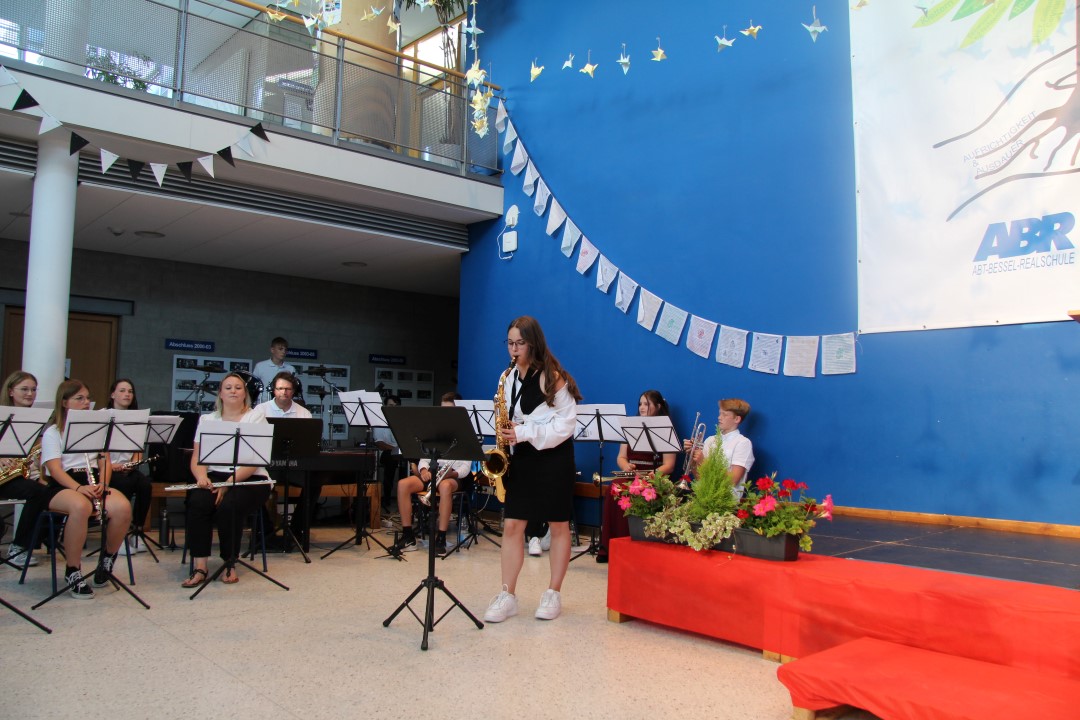 Der Abend wurde von der Schulband unter Leitung von Christoph Blaumeiser mit dem Stück „Something Stupid“ festlich eröffnet. Im Anschluss daran begrüßte Konrektor Magnus Brünner die Anwesenden und eröffnete freudig, dass dieses Schuljahr alle Schüler bestanden haben, die zur Prüfung angetreten sind. Gleichzeitig betonte er, dass die Entlassfeier jedoch auch einen traurigen Aspekt hat: Nämlich, dass die Absolventen nun keine Schüler der ABR mehr sind, sondern mit Übergabe der Zeugnisse jetzt zu den Ehemaligen zählen.