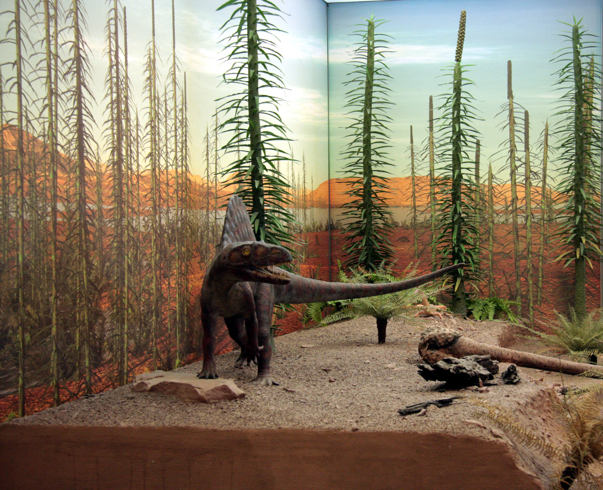 Bild 1: Typische karge, halbwüstenartige Landschaft der Buntsandstein-Zeit. Das Klima ist heiß und trocken. Bärlappgewächse (Pleuromeia) und Farne kommen mit dem wenigen Wasser und der Hitze klar. Ein Arizonasaurus stapft durch den Schlamm in der Nähe eines Flusses und hinterlässt seine Fußspuren. (Foto: C. Hanak)