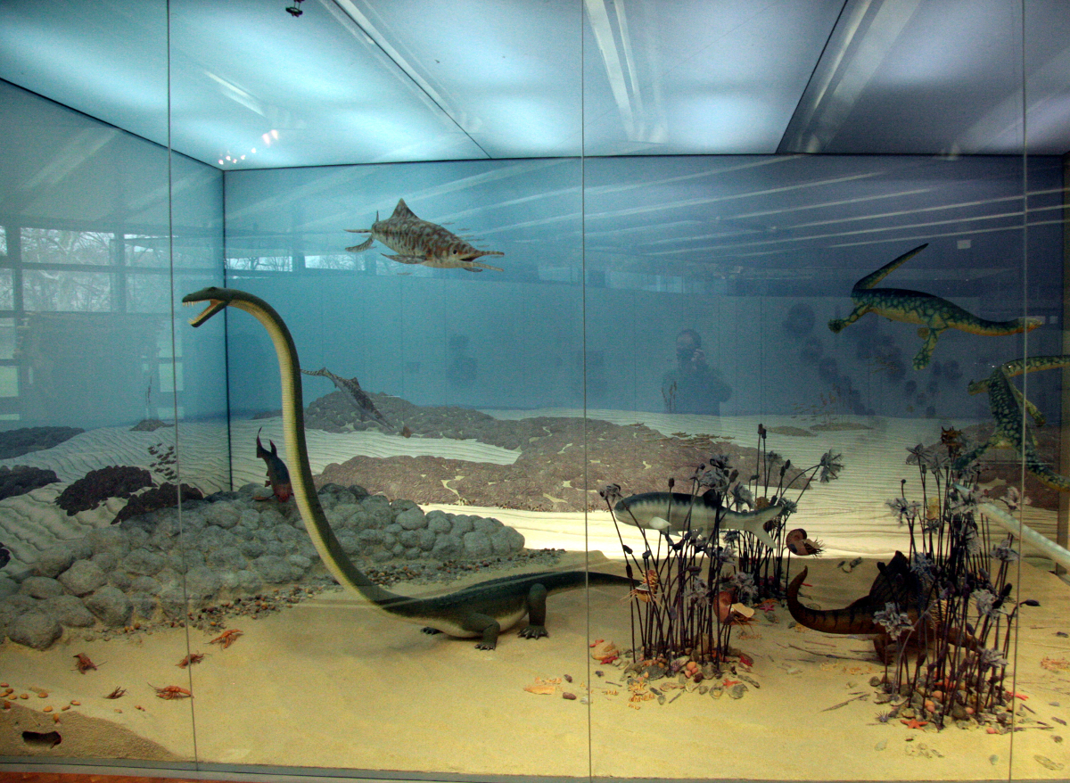 Zu Beginn der Muschelkalk-Zeit vor ca. 241 Millionen Jahren wurden die Wüstenregionen der Buntsandstein-Zeit von einem Randmeer der Tethys überflutet. Die Tethys war ein Ozean im Erdmittelater, als dessen Überrest das heutige Mittelmeer angesehen wird. Es entstand ein flaches, bis 100 Meter tiefes Meeresbecken, das nur noch eine eingeschränkte Verbindung zur offenen Tethys hatte. In diesem, nun weitgehend von den Weltmeeren abgeschotteten tropischen Flachmeer, konnten sich in den folgenden Jahrmillionen eigenständige Arten entwickeln. Kolonien von Seelilien, Muscheln und Armfüßern (Brachiopoden) besiedelten den Meeresboden. Auch die Ceratiten, eine eigenständige schalentragende Tintenfischart entwickelten sich im Muschelkalkmeer. Sie sind eine Besonderheit, da es sie nur dort gab. Das schneckenförmige Gehäuse dieser Tintenfische war durch Querwände unterteilt, wobei das Tier selbst nur die äußerste Kammer „bewohnte“, die bei Gefahr mit einer Kopfkappe geschlossen werden konnte. Ansonsten ragten vorne nur die für Tintenfische typischen Fangarme heraus. Daneben gab es im Muschelkalkmeer auch zahlreiche, an das Wasserleben angepasste Reptilien, wie zum Beispiel den fischartig aussehenden, lebend gebärende Mixosaurus oder die Pflasterzahnechse Placodus gigas. Letztere hatte sich darauf spezialisiert, hartschalige Tiere wie Muscheln oder Brachiopoden mit ihren spatelförmigen Zähnen vom Felsen zu schaben, um sie anschließend mit ihren starken Mahlzähnen aufzuknacken. Ihre rundlichen, harten Zähne werden noch heute regelmäßig im Muschelkalk gefunden.