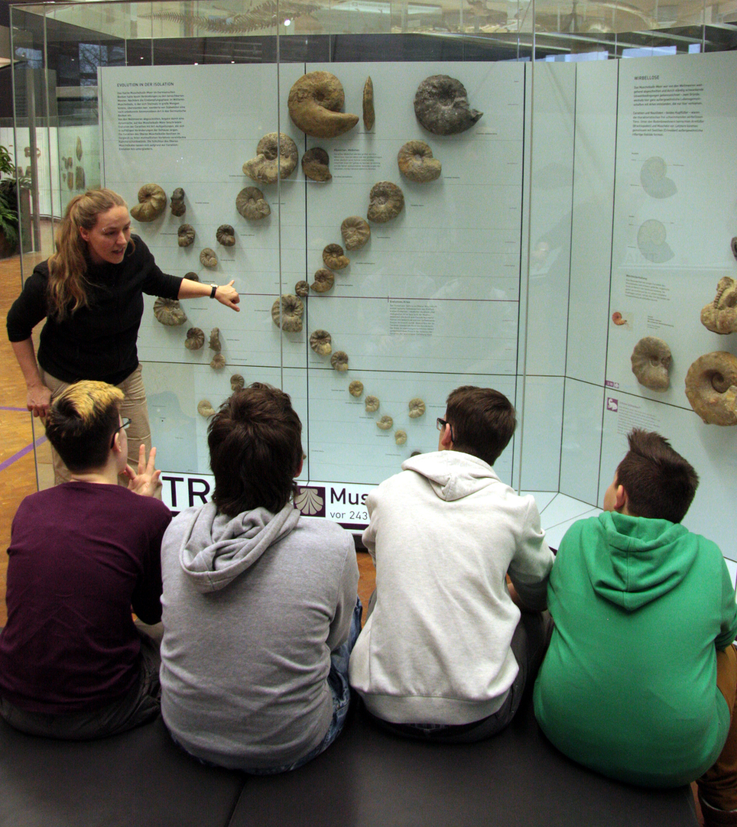 Schnell wurde dabei klar, dass eine Antwort darauf nur in der Geologie und der Erdgeschichte gefunden werden kann. Wie der Sandstein im Odenwald, sind auch die Kalkgesteine im Bauland in der Trias entstanden. Einer erdgeschichtlichen Epoche, die vor etwa 250 Millionen Jahre begann und vor zirka 200 Millionen Jahre endete. In Deutschland lässt sich die Trias in die drei Abschnitte Buntsandstein, Muschelkalk und Keuper unterteilen. Doch, welche Bedingungen herrschten eigentlich auf der Erde und wie sah das Leben aus, als in der Buntsandstein-Zeit die roten Sandsteine des Odenwaldes und in der Muschelkalk-Zeit die Kalkgesteine des Baulandes entstanden sind? Um Antworten auf diese und weitere Fragen zu erhalten, hieß es in diesem Schuljahr auf ins Museum am Löwentor nach Stuttgart!