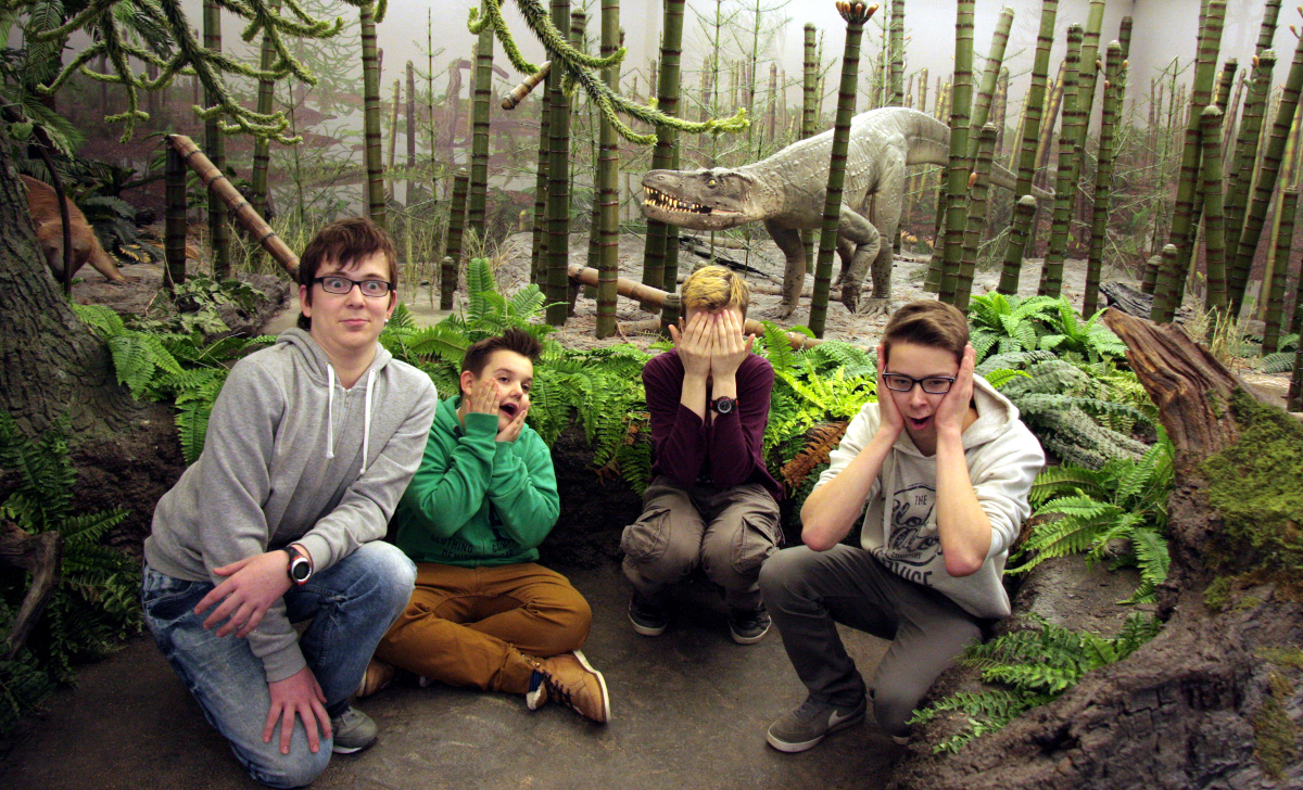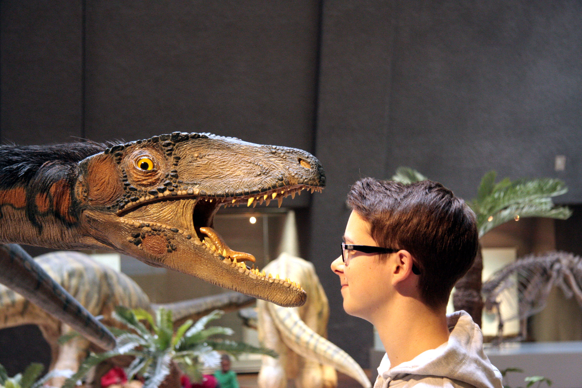 Bild 5: Aug in Aug mit der Erdgeschichte. Ein noch sehr urtümlicher Dinosaurier der Gattung Liliensternus aus dem Mittleren Keuper „beschnuppert“ ein Mitglied der Geopark-AG. (Foto: C. Hanak)
