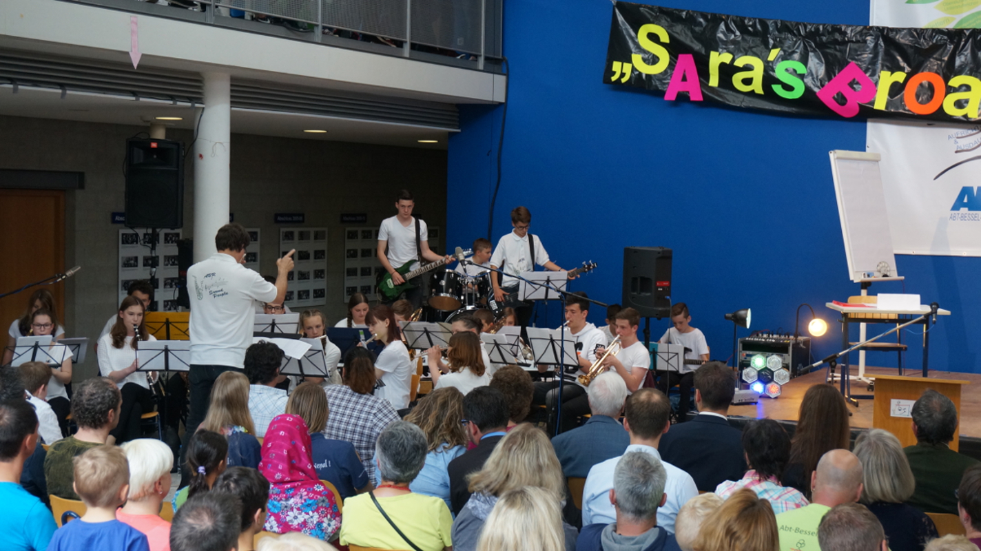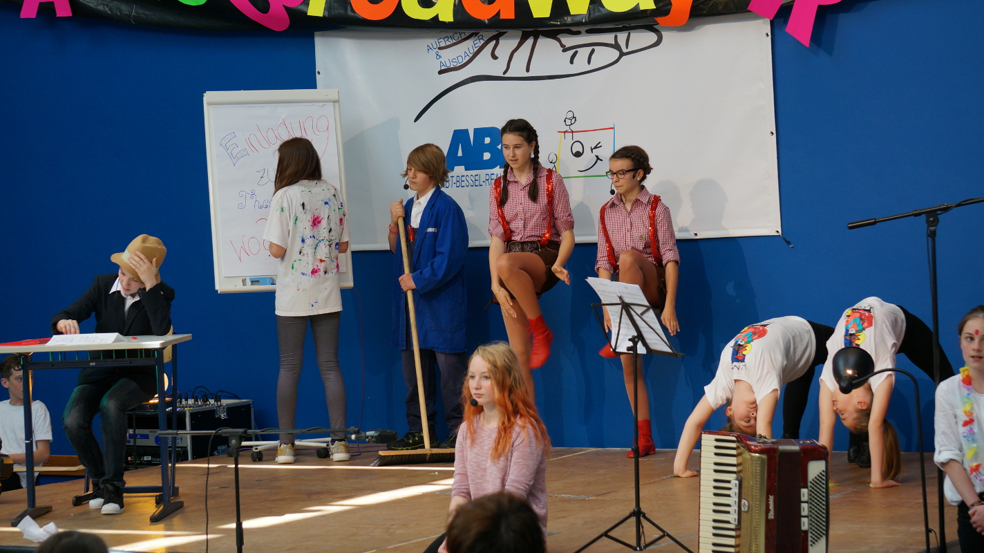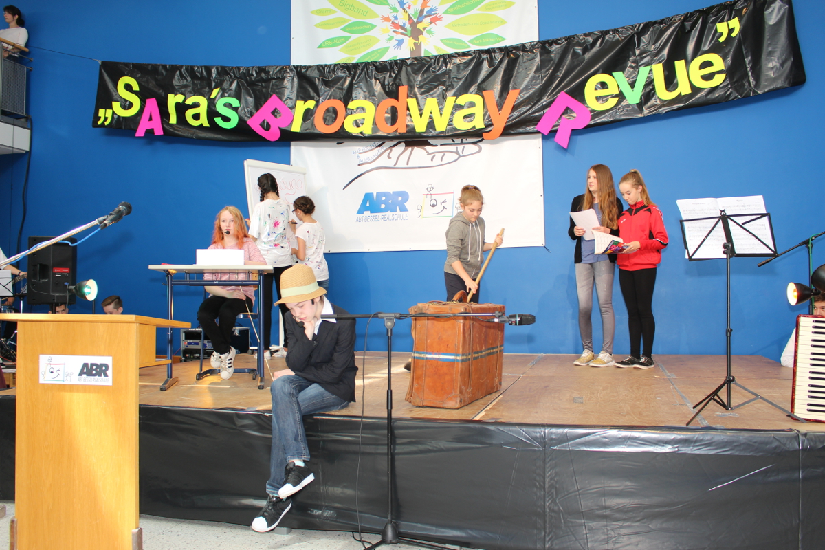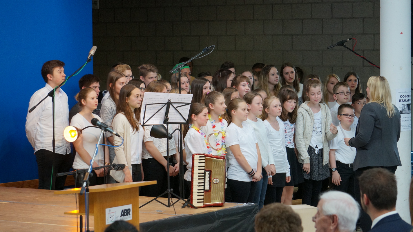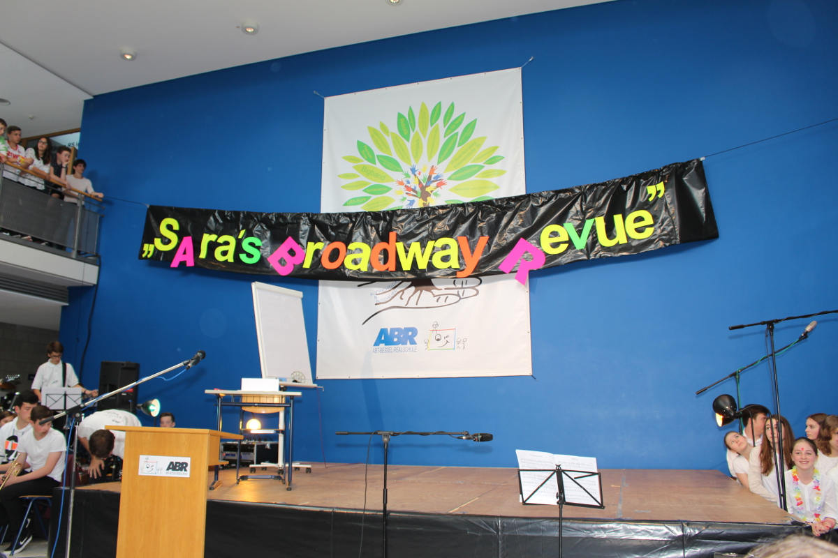 Die Angebote in den Klassenräumen wurden durch ein Rahmenprogramm in der Aula ergänzt. „Colors of Broadway“, eigens für dieses Schulfest entworfen, wurde von den Chören, der Bigband und der Theater-AG inszeniert. Die beteiligten Schüler und Lehrer ließen die Geschichte um den Einwanderer Francesco in New York am Broadway lebendig werden. Francesco und alle Künstler von „Sara`s Broadway Revue“ gaben den Zuschauern am Schluss zu verstehen, dass für ein gelingendes Miteinander die zahlreichen Talente und Begabungen aller – richtig eingesetzt – wichtig und gewinnbringend sind.