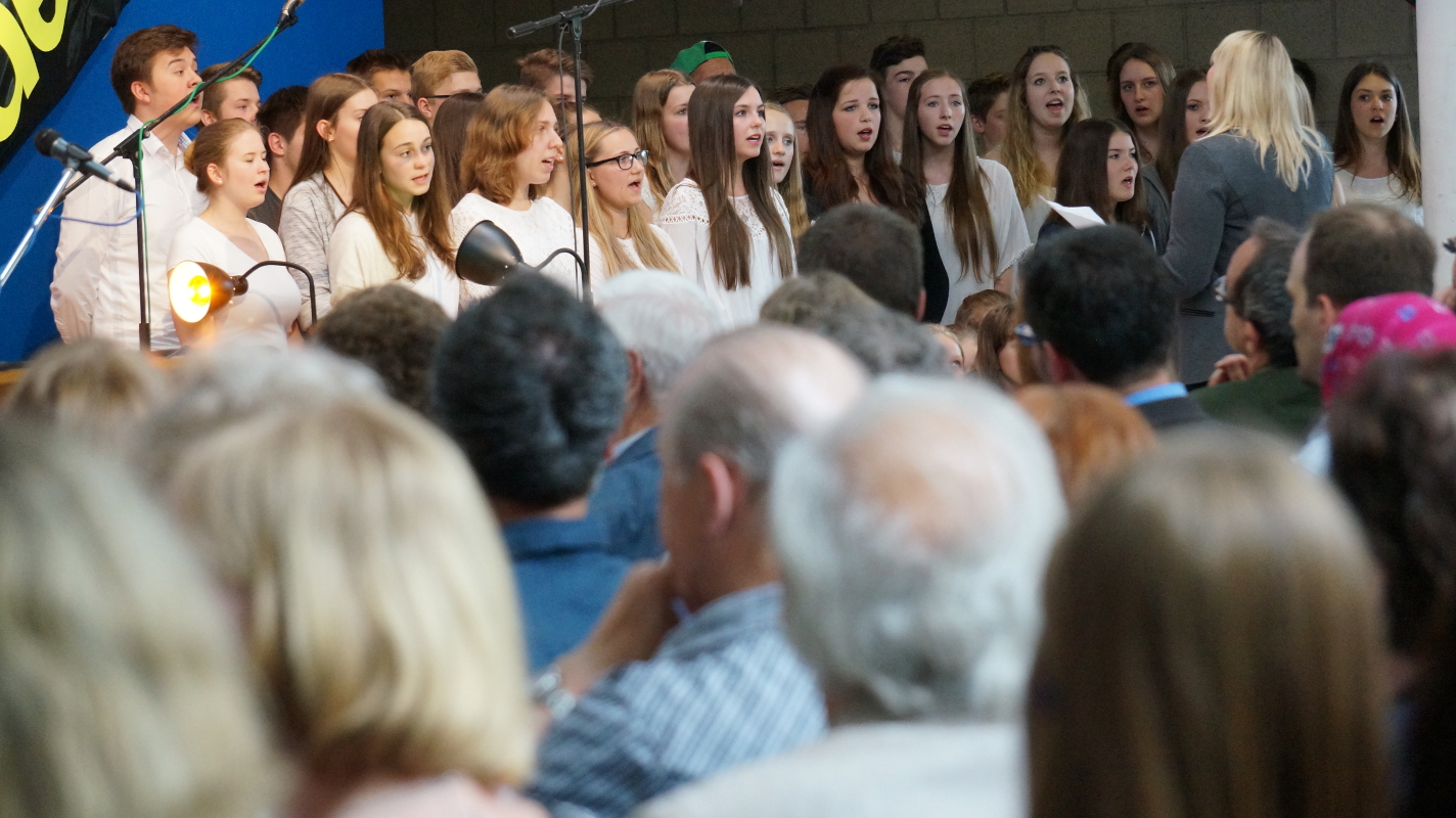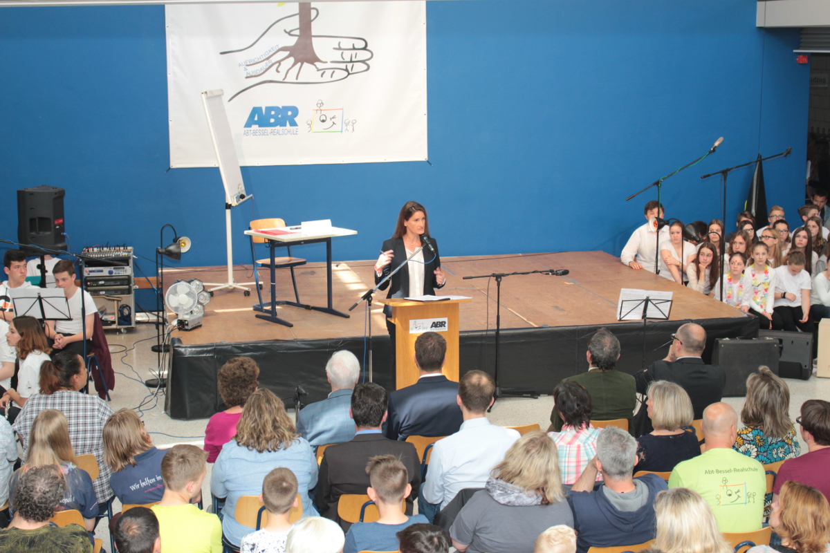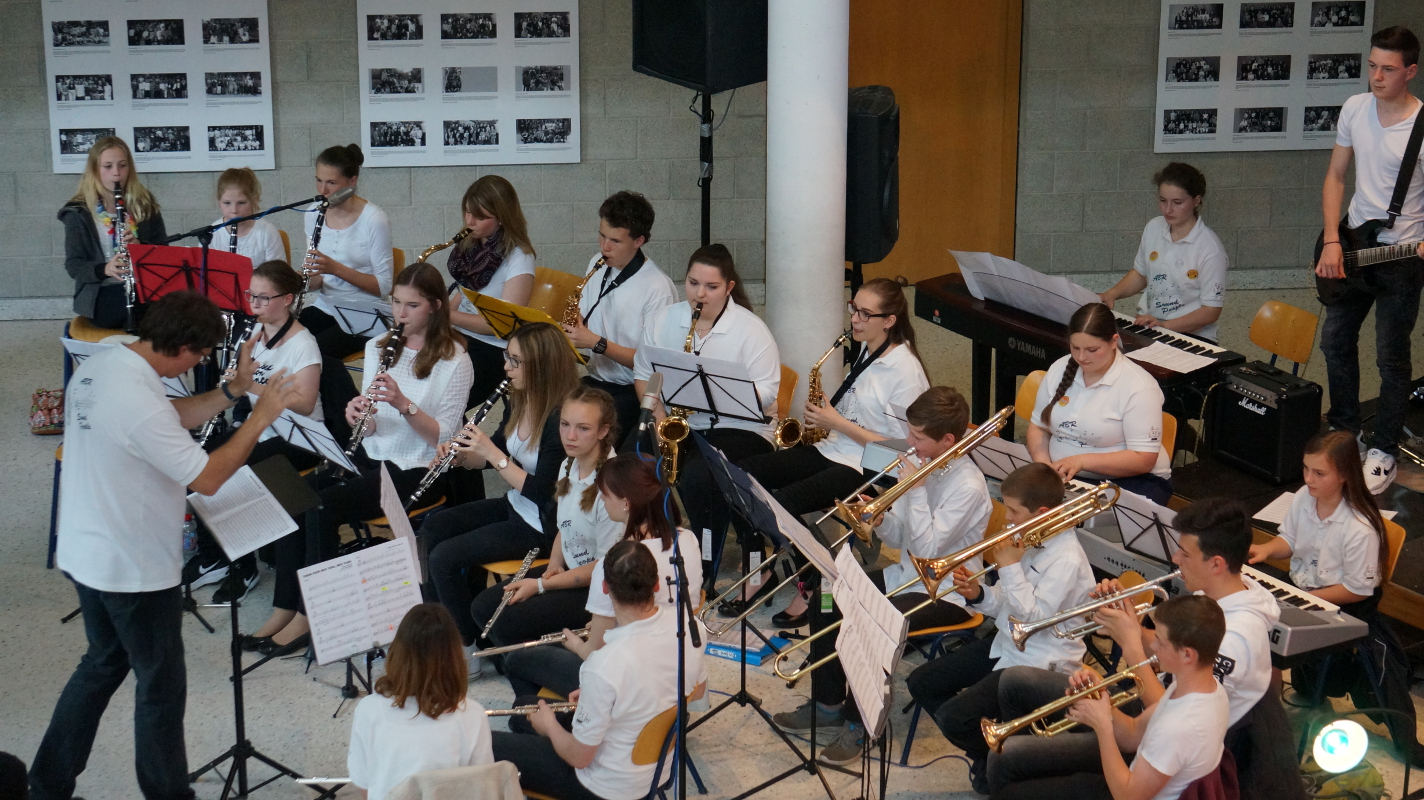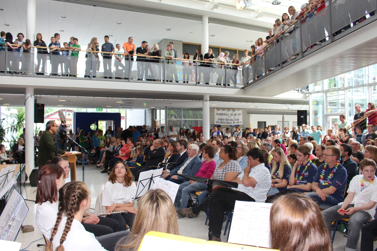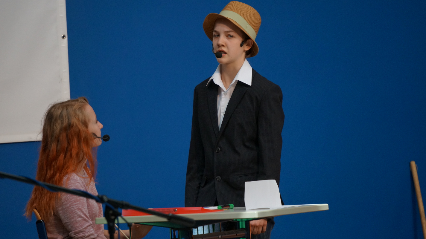 Die Angebote in den Klassenräumen wurden durch ein Rahmenprogramm in der Aula ergänzt. „Colors of Broadway“, eigens für dieses Schulfest entworfen, wurde von den Chören, der Bigband und der Theater-AG inszeniert. Die beteiligten Schüler und Lehrer ließen die Geschichte um den Einwanderer Francesco in New York am Broadway lebendig werden. Francesco und alle Künstler von „Sara`s Broadway Revue“ gaben den Zuschauern am Schluss zu verstehen, dass für ein gelingendes Miteinander die zahlreichen Talente und Begabungen aller – richtig eingesetzt – wichtig und gewinnbringend sind.