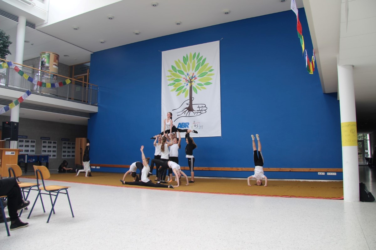 Realschulrektorin Monika Schwarz hieß im Foyer der Schule die Teilnehmer herzlich willkommen und zeigte sich erfreut, dass die Abt-Bessel-Realschule die Gastgeberrolle für diesen Ehrungs-Event übernehmen durfte. Besondere Grüße verbunden mit Dank richtete sie an die Sportlehrerinnen und Sportlehrer, die ja bei der Abwicklung dieses Wettbewerbs die Hauptlast zu tragen hatten. Eine Turnerinnen-Riege der Realschule verlieh durch eine gelungene und mit viel Beifall bedachte Darbietung dem Ehrungsakt eine themengerechte sportliche Atmosphäre.